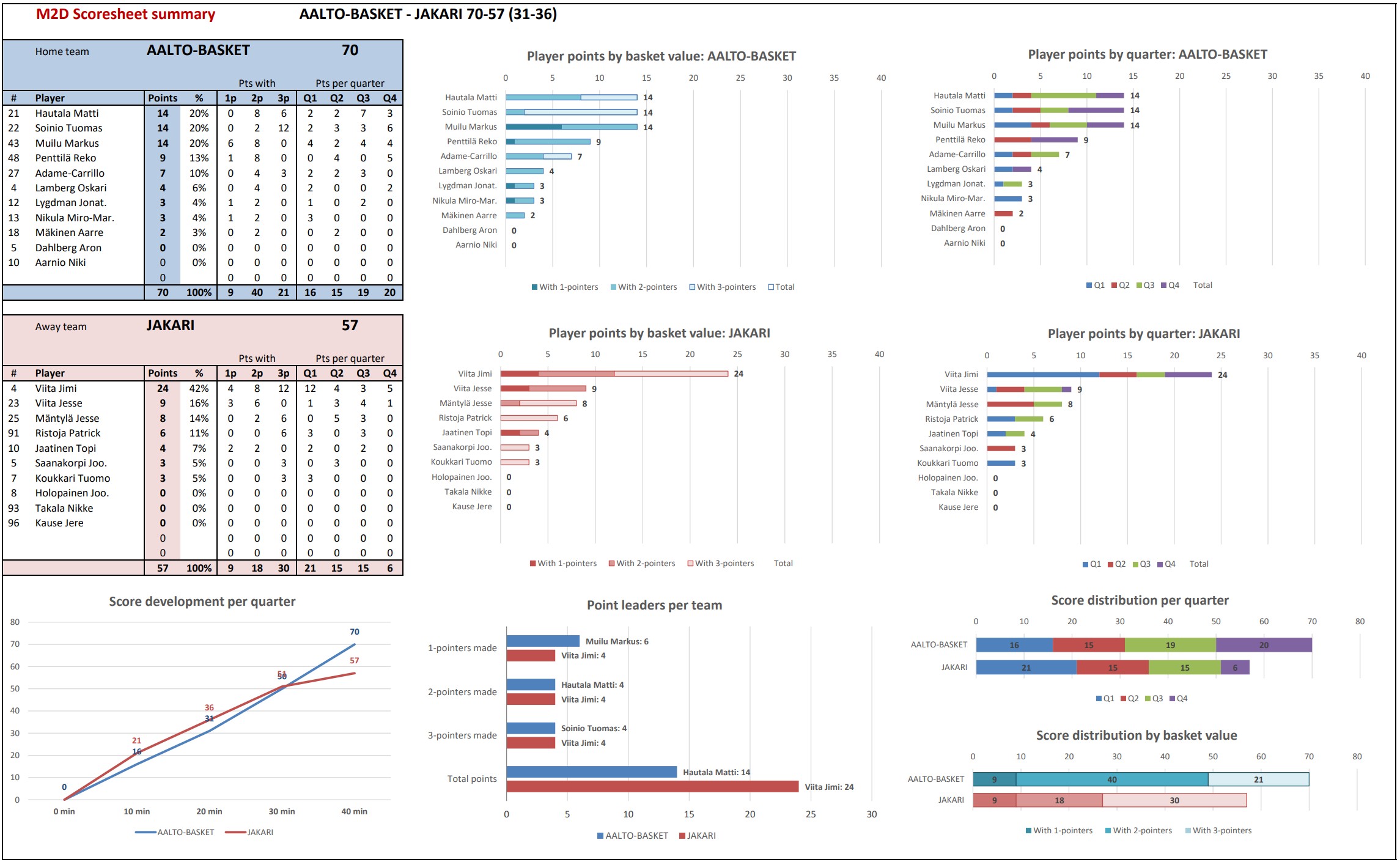 Parhaina pistemiehinä toimi Tuomas Soinio 14 pisteellä (4 kolmosta), Markus Muilu 14 pisteellä (6 onnistuneella vapaaheitolla!) ja Matti Hautala 14 pisteellä. Ensi sunnuntaina Aalto-basketin kausi jatkuu 101 Basketball team:ia vastaan Kisiksellä!